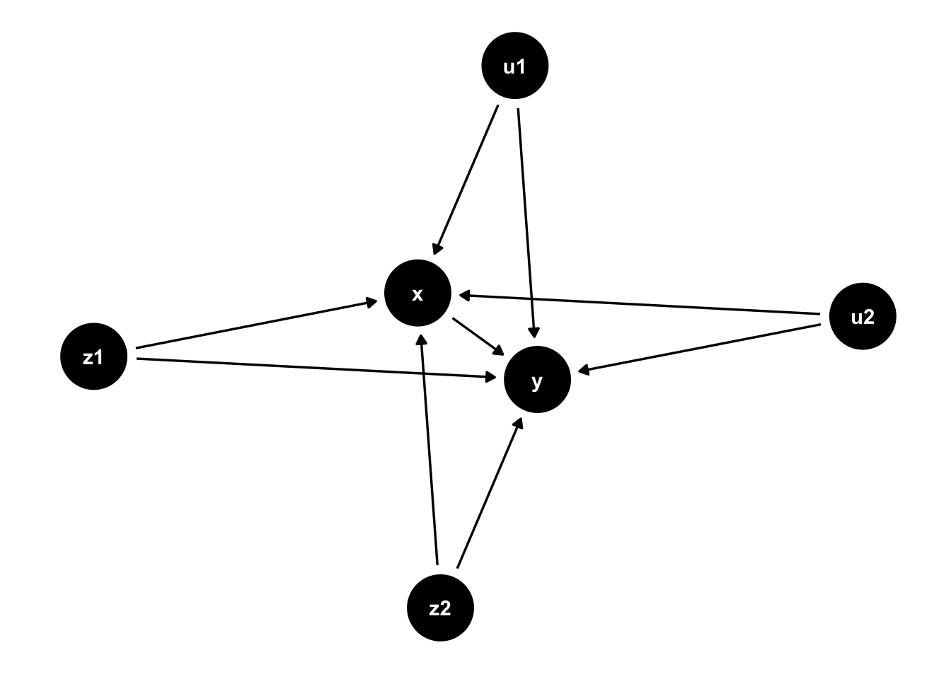 theme_set(theme_dag())dag_example <- ggdag::dagify( x ~ z1 + z2 + u1 + u2, y ~ z1 + z2 + u1 + u2 + x, exposure ="x",outcome ="y")ggdag::ggdag(dag_example, layout ="nicely")